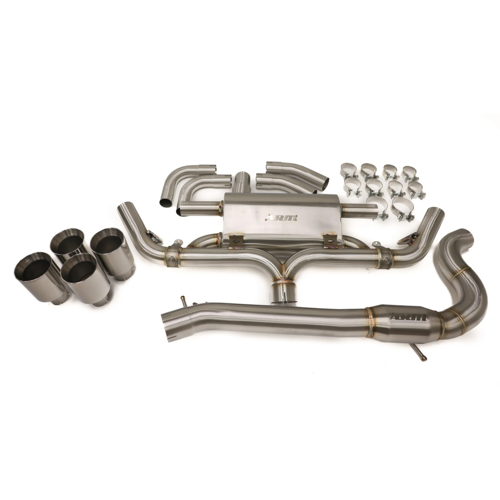 The ARM MK8 Golf R Catback is constructed entirely from T304 stainless steel using CNC mandrel-bent tubing with a consistent wall thickness for strength and durability. The ARM MK8 Golf R Exhaust features a straight through resonated 3.0" exhaust path from the downpipe into the muffler assembly, maximizing exhaust flow and reducing restriction compared to the factory system. After the muffler, the system transitions into quad tailpipes for balanced flow distribution and a clean rear-exit appearance using rolled, 101mm quad exhaust tips.
